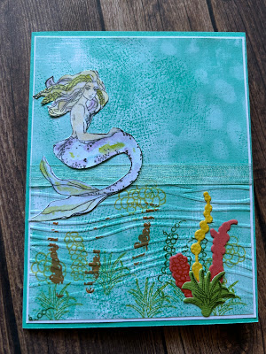 The sketch shows 2 different patters on the background layer. I didn't have any paper to coordinate with this gorgeous blue paper from the Unbounded Beauty DSP from Stampin' Up! I loved these papers so much I have used them all. This is the last piece. I cut the piece in two and embossed the bottom piece with a wavy E/F. Then I used some succulent stamps on the lower half. I think these succulents look like underwater plants and coral reef. I added a few die cut pieces to bring in more seaweed. Then I matted both of the blue pieces on a white background and ran a ribbon across the seam. The mermaid is an old stamp from my stash, She is watercolored and fussy cut. Look closely to see a stamped floral shape next to the mermaid, bringing in that flower element of the sketch.